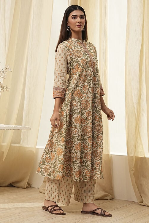 Imagine stepping into a sunlit courtyard, the gentle breeze playing with your kurta. The Beige Floral Kalidar Kurta Set is the epitome of style and comfort and should be your go-to for such serene moments. This comfortable two-piece kurta set is crafted from soft, breathable cotton and provides all-day comfort without compromising on style.