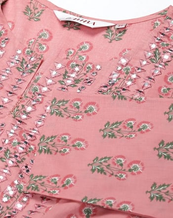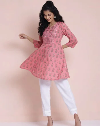 A dusky pink short kurti with floral patterns and faux mirror embellishments