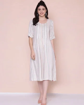 This outfit features a stylish striped tunic that falls just below the knees. This kurta is made out of viscose flax, a material that feels and looks like silk. The multicolored stripes that decorate the beige base bring the perfect combination of formal and casual outfits. It is an A-line dress with no slits and can hence be worn as a dress as well. You can look dashing in a video call meeting at work and be comfortable at home during your breaks. You can wear a high bun or a half-bun to add elegance to your attire. Top off your outfit with colorful accessories to match the multicolored stripes on this dress!