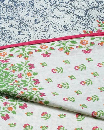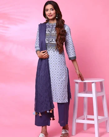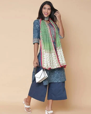 Parties and get-togethers are extremely fun, especially when you are the host. Tuning the ambience to your liking and organizing appropriate activities bring a lot of responsibility and excitement. But a party does not mean you always have to pick out a heavy, glamorous dress from your closet. You can wear a casual set that does not compromise on elegance and look dazzling. Check out BIBA’s blue cotton straight suit set for this occasion. This set comes with a straight, blue cotton kurta and a matching pair of palazzo pants. You also get a reversible dupatta in this set! What more do you need to absolutely own the night? The kurta features a subtle blue fabric decorated with tiny floral patterns in pink and orange. The pant is dark blue and plain, hence enhancing the top and dupatta. The dupatta is reversible and stands out in contrast. The green and white fabric accompanied by floral patterns of pink and orange complement those on the kurta.